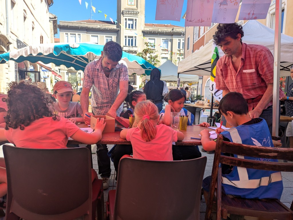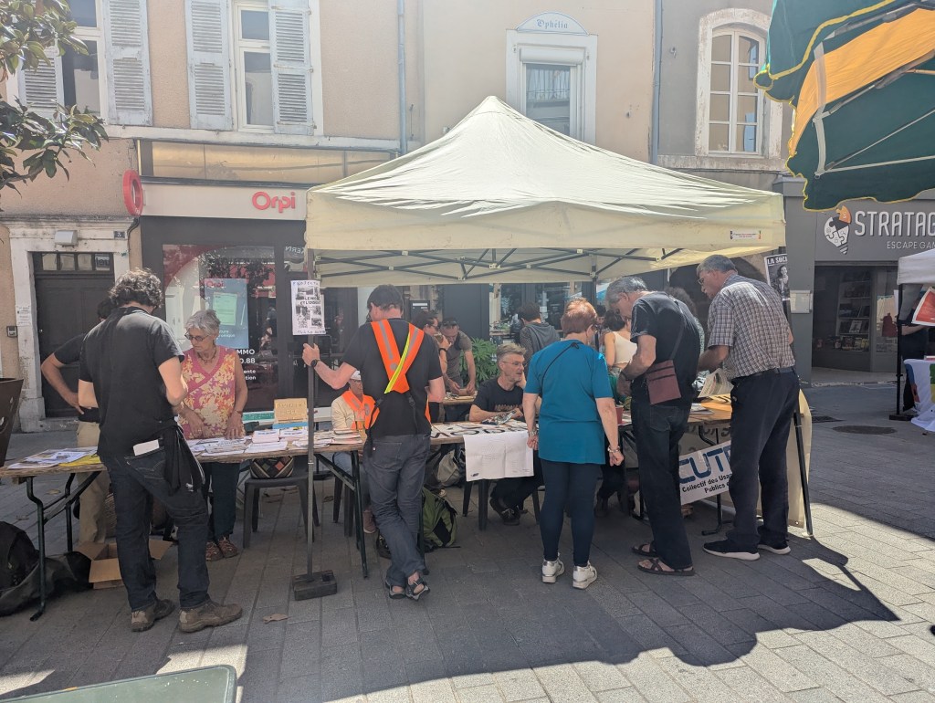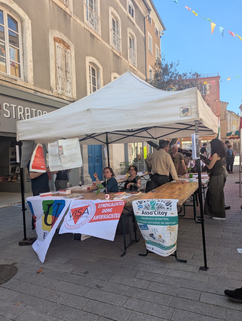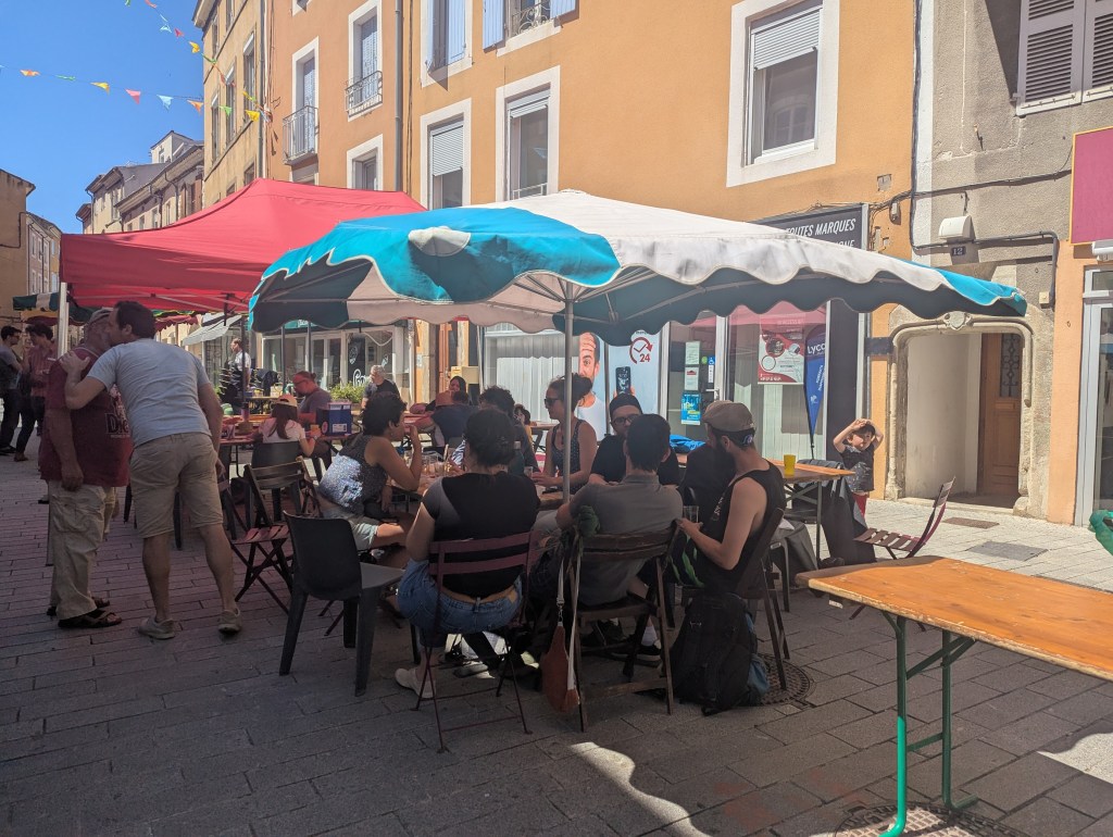 Pendant ce temps-là, les associations invitées s’installaient et engageaient la conversation avec les participant.e.s. On pouvait parler mobilité avec Modal, syndicalisme avec la FSU et la CGT, féminisme avec les renouées, transports ferroviaires avec la Cutpsa, citoyenneté avec l’Asso’Citoy et agriculture avec la Confédération Paysanne.