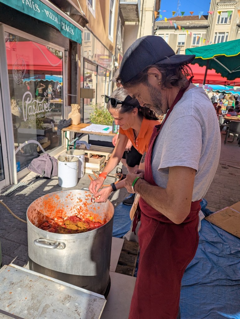 Nos cuisinier de choc ont préparé un couscous végétarien avec l’aide de participant.e.s pour l’épluchage et le découpage des légumes, dans la joie et la bonne humeur. Les mangeurs semblent avoir apprécié ce dîner à prix libre, nous étions ravis !