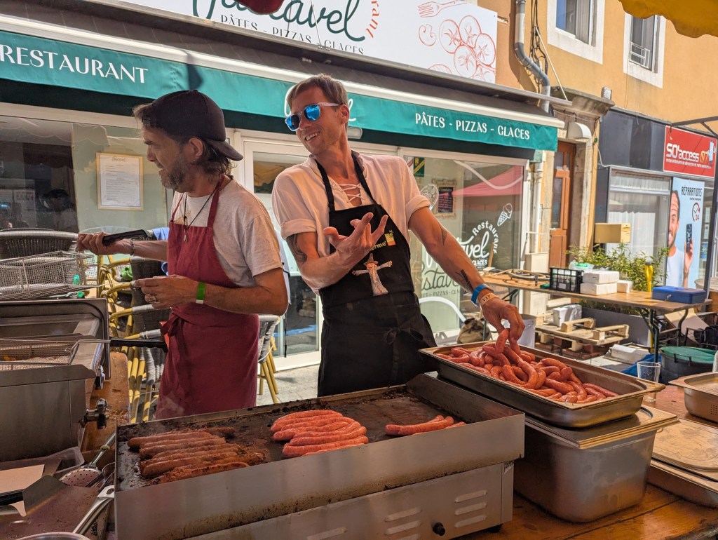 - A midi: saucisses (halal) frites, au sortir de la manifestation syndicale du matin, pour lancer le festival