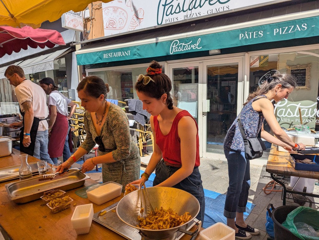 La manifestation syndicale du matin est arrivée sur la place de l’hôtel de ville où la chorale « La Castagne » a entonné plusieurs chansons de lutte, il était midi environ et nous n’avions pas pu précuire toutes nos frites à cause d’un faux contact. Donc il y a eu la queue pour manger les frites et les saucisses de la boucherie Al Atlas.