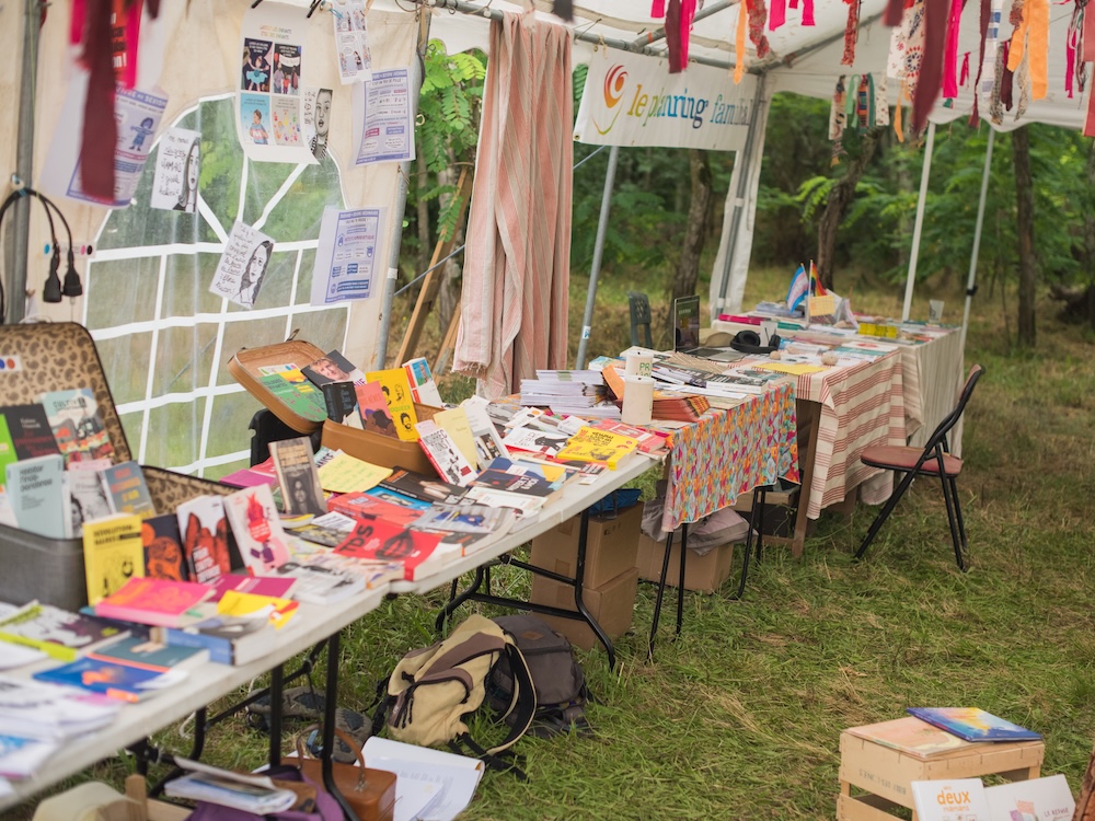 Le samedi matin, c’était installation des stands, pour les collectifs qui voulaient s’afficher, se tenir prêt à être découverts. On y était donc, mais aussi le planning familial d’Ardèche, le collectif écran total, le collectif « garrigues vivantes STOP artificialisation« , le collectif du 8 mars d’Aubenas. A côté de nous, l’espace bibliothèque, et un peu plus loin la tente de projection et celle pour se reposer un peu, se détendre si la fatigue ou le stress prennent le dessus.